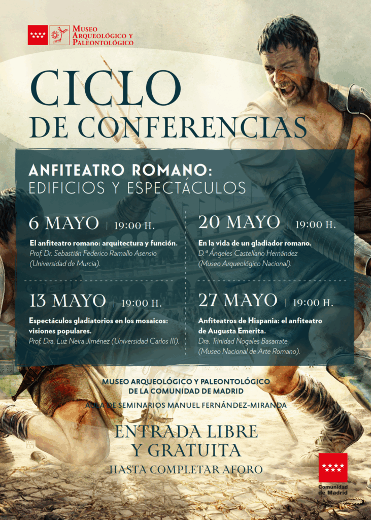 Con motivo de la Exposición: Hispano, Gladiadores en Imperio Romano, que tiene lugar en el Museo Arqueológico y Paleontológico de Alcalá de Henares, comisariada por la directora del Museo Nacional de Arte Romano, Dña Trinidad Nogales Basarrate y Dña Angeles Castellano Hernández del Museo Arqueologico Nacional, se va a llevar a cabo un Ciclo de Conferencia, todos los martes del mes de Mayo en dicho Museo bajo el título “Anfiteatro romano: Edificios y Espectáculos”.