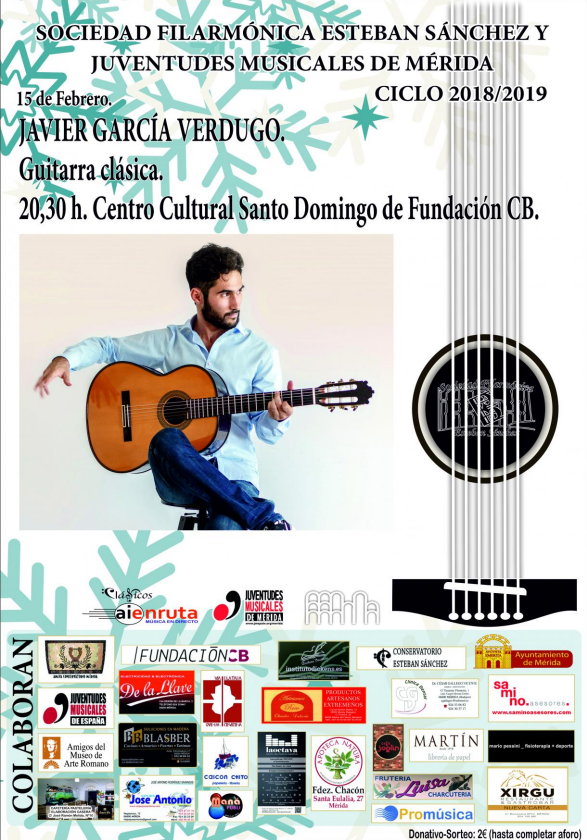 Continuando con nuestro ciclo ordinario de conciertos, os comunicamos que este próximo viernes, día 15 de febrero, a las 20:30 horas, en el Auditorio de la fundación CB de Mérida, tendrá lugar un Concierto de Guitarra Clásica a cargo del joven intérprete Javier García Verdugo.