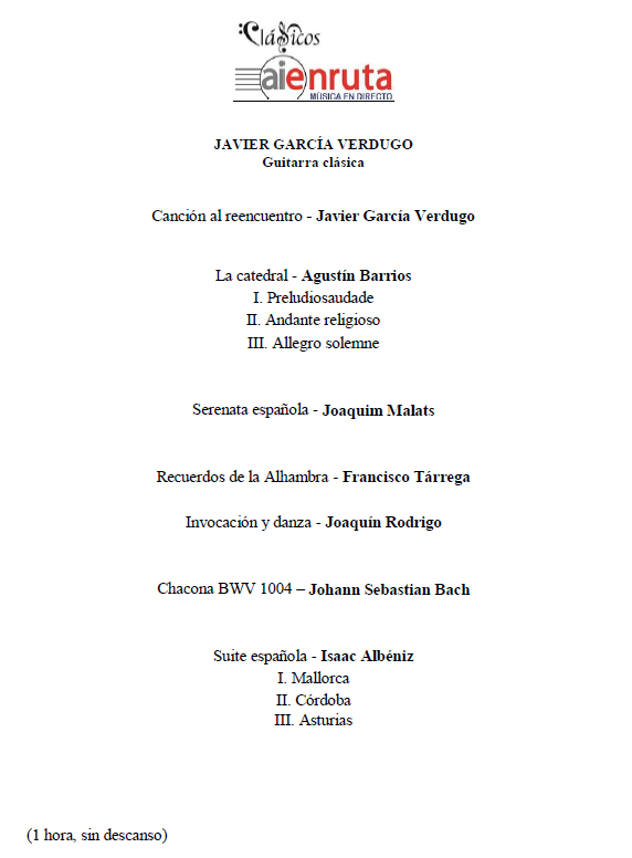 En este concierto vuelve a colaborar con nosotros el programa CLÁSICOS EN RUTA, cuya finalidad principal es la creación de un circuito de conciertos de música clásica destinados a los jóvenes intérpretes con el fin de que músicos de alto nivel tengan la oportunidad de actuar dentro de un programa estable, dando a conocer sus trayectorias profesionales y difundiendo la música clásica a través de nuevos valores mediante la interpretación de los clásicos.