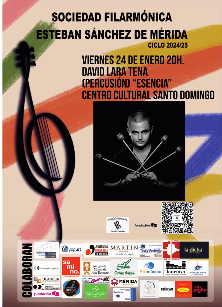 Nuestro siguiente concierto de esta temporada 2024-2025 tendrá lugar este próximo viernes, día 24 de enero a las 20:00 horas, en el Auditorio del Centro Cultural Santo Domingo de la Fundación CB de Mérida con un concierto de percusión a cargo del joven intérprete David Lara Tena, que lleva por título «Esencia« y que mediante estilos musicales distintos entre sí pero que a la vez mantienen un nexo de unión, nos transportará a esa Esencia que se podría definir como las raíces de una persona. Entre otras escucharemos piezas de N.J.Zivkovic, E.Sammut, D.Lara, D.Skoog, E.Sejourné y F.Tárrega.