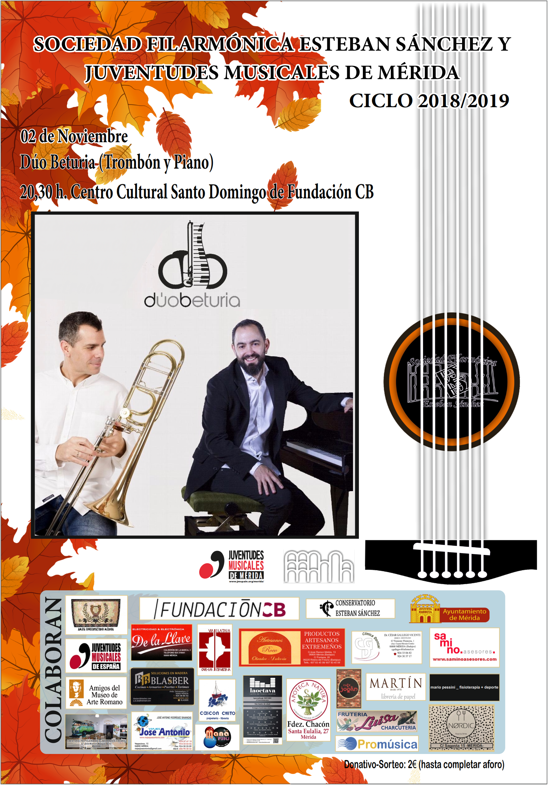 Comenzamos esta nueva temporada 2018-2019 con un concierto que tendrá lugar este próximo viernes, día 2 de noviembre, a las 20:30 horas, en el Auditorio de la fundación CB de Mérida, a cargo del Dúo Beturia,compuesto por Juan Fortes, trombón y Daniel Barroso, piano, que presentarán una interesante propuesta musical en la que numerosos temas derivados de la música española son transformados y presentados de forma distinta a través de la sonoridad del piano y la brillantez del trombón.