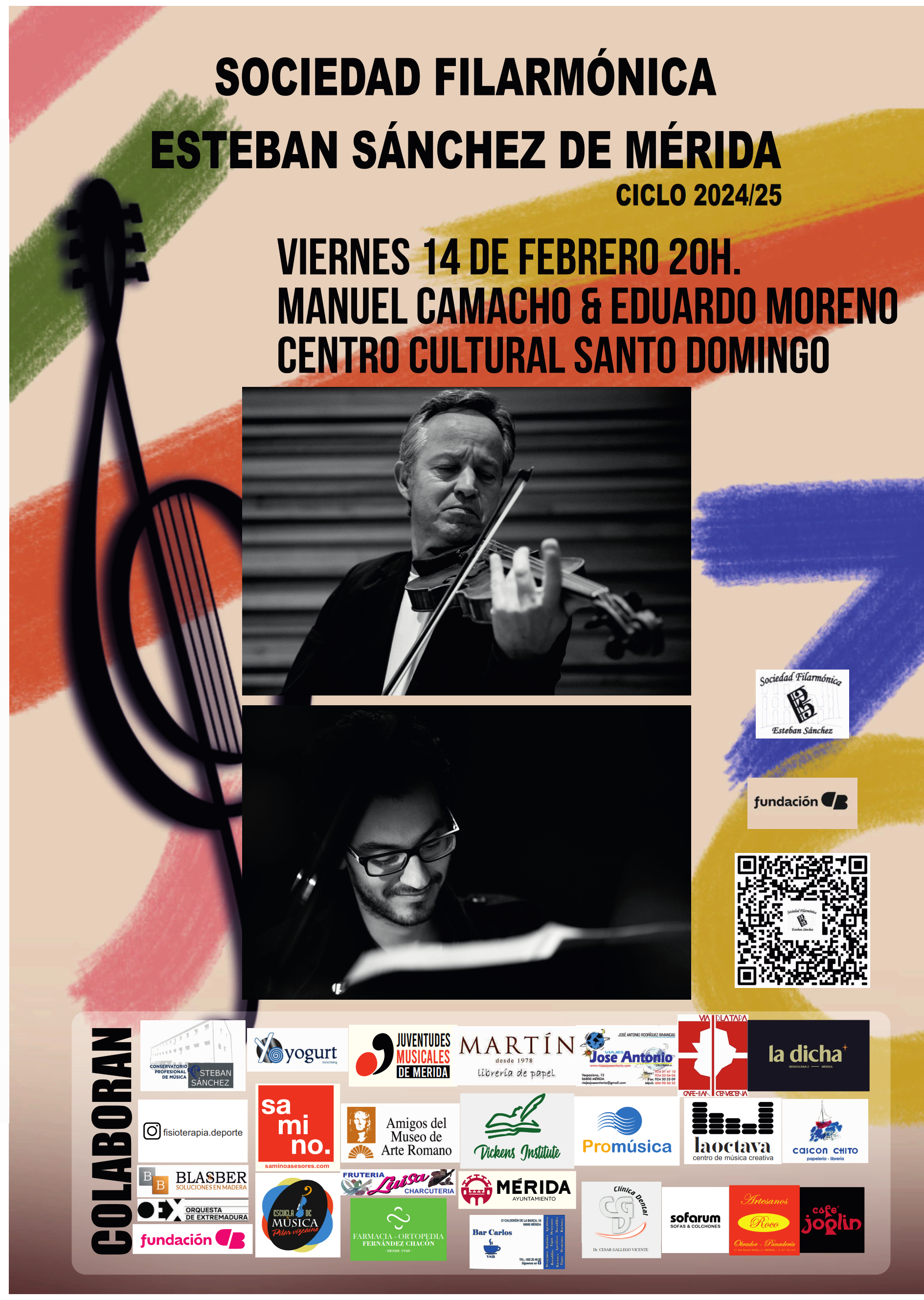 Nuestro siguiente concierto de esta temporada 2024-2025 tendrá lugar este próximo viernes, día 14 de febrero a las 20:00 horas, en el Auditorio del Centro Cultural Santo Domingo de la Fundación CB de Mérida con un concierto de Violín y Piano a cargo, respectivamente de Manuel Camacho y Eduardo Moreno, ambos docentes del Conservatorio Superior de Música Badajoz, que nos deleitarán con un variado programa en el que escucharemos piezas de W.G. Mozart, Maurice Ravel, P.I.Tchaikowski y P. Sarasate, entre otros.