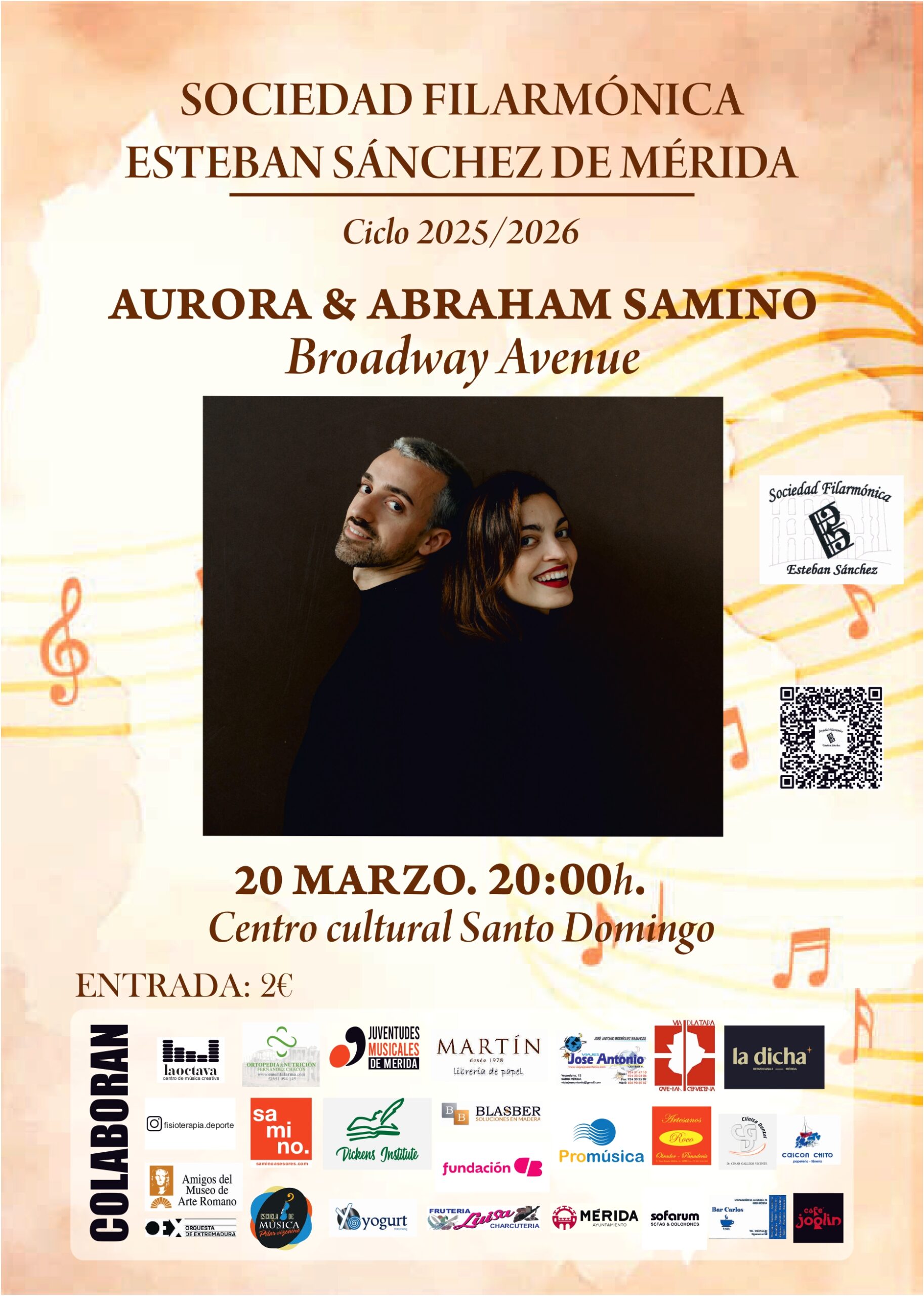 Os adelantamos que nuestro siguiente evento de esta temporada 2025-2026 tendrá lugar el próximo viernes, día 20 de marzo a las 20:00 horas, en el Auditorio del Centro Cultural Santo Domingo de la Fundación CB de Mérida con un concierto de Voz y Piano a cargo, respectivamente de Aurora Samino y Abraham Samino, ambos artistas emeritenses, que nos interpretarán, al más puro estilo de BROADWAY, canciones de musical y personajes de películas conocidos por todos; la música trazará un recorrido emocionante por sus historias y nos descubrirá su auténtico mensaje.