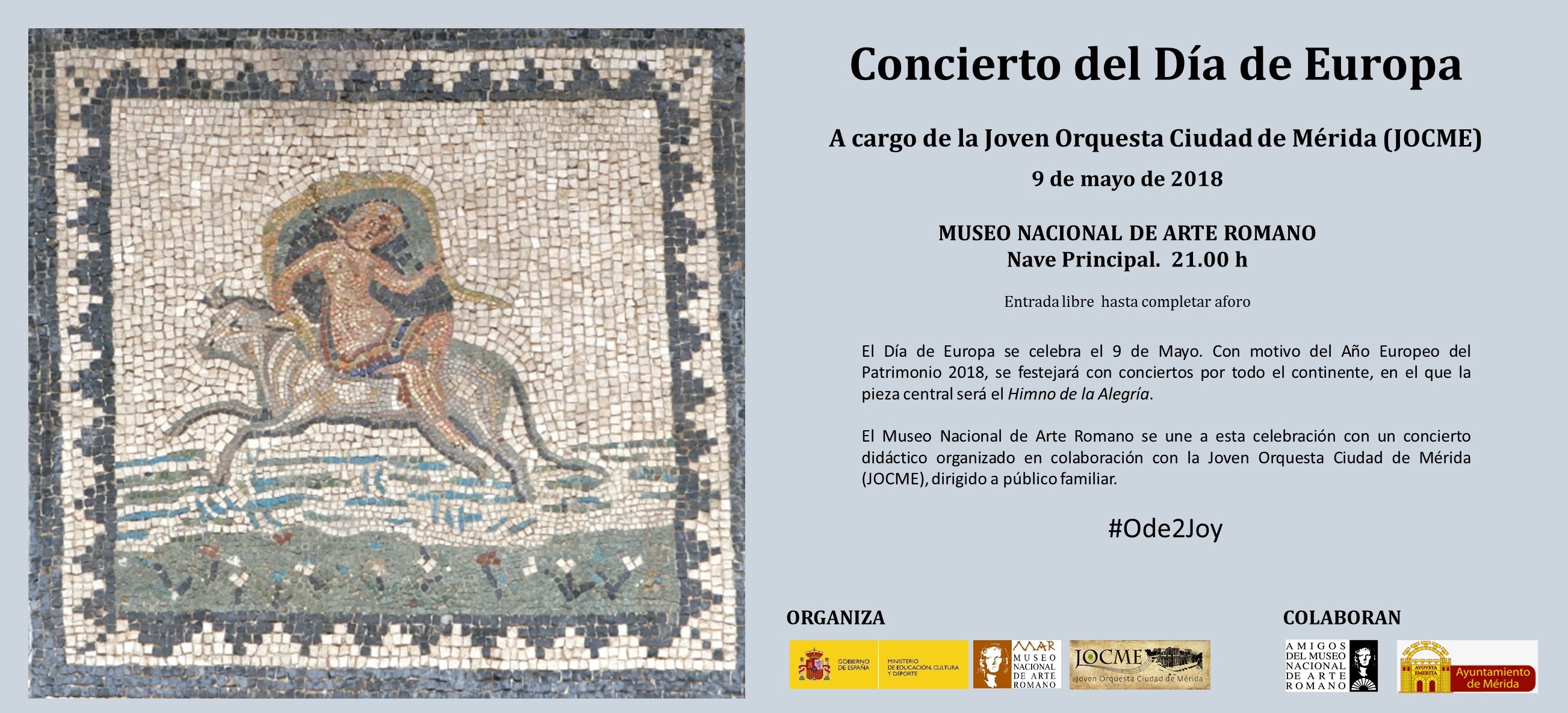 Con motivo del año Europeo del Patrimonio 2018, Día de Europa que se celebra el 9 de mayo, se festejará con conciertos por todo el continente, en el que la pieza central será el Himno de la Alegría.