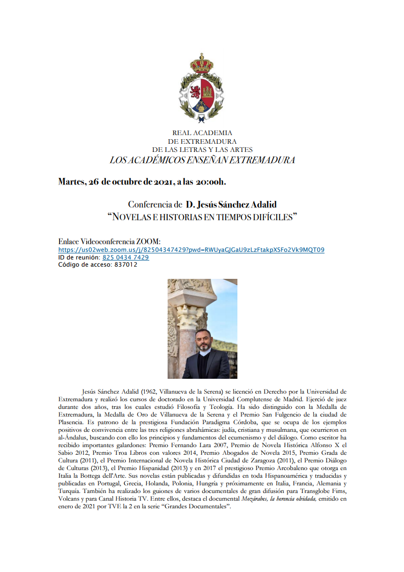 Adjuntamos invitación a la conferencia que nos remite la Real Academia de Extremadura de las Letras y las Artes, de D. Jesús Sánchez Adalid que bajo el título “Novelas e historias en tiempos difíciles” tendrá lugar el martes día 26 de Octubre a las 20,00h.