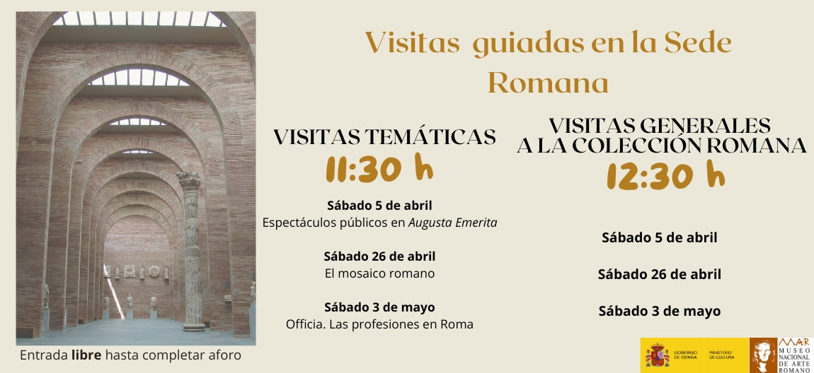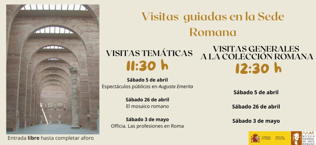 | Ubicación: Sede Romana del MNAR Entrada libre hasta completar aforo (el grupo se conformará por orden de llegada los 15 minutos previos a la visita) Más información en el siguiente enlace 5 de abril 11:30 h Espectáculos públicos en Augusta Emerita 12:30 h Visita general a la Colección Romana 26 de abril 11:30 h El mosaico romano 12:30 h Visita general a la Colección Romana |