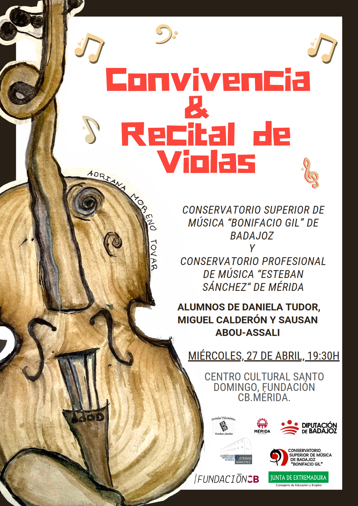 Como colaboradores en el evento y siendo uno de los intereses prioritarios de nuestra asociación el potenciar y dar a conocer el trabajo de jóvenes intérpretes fomentando su formación, os comunicamos que el próximo miércoles 27 de abril a las 19.30 horas tendrá lugar en el Centro Cultural Santo Domingo de la Fundación CB de Mérida un recital de violas por parte de alumnos de los conservatorios superior de música «Bonifacio Gil» de Badajoz y profesional «Esteban Sánchez» de Mérida. En archivo adjunto enviamos el cartel del acto.